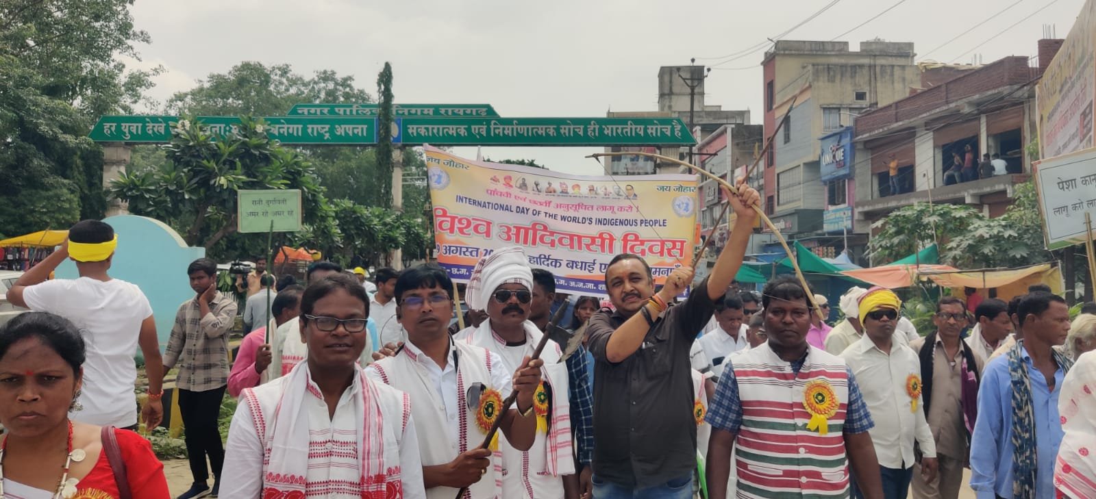 विश्व आदिवासी दिवस के मौके पर सर्व आदिवासी समाज ने एकजुट होकर रायगढ़ शहर में बाजे गाजे के साथ भव्य रैली निकाली और एकता का परिचय दिया।जिसमें जिलेभर से अनुसूसित जाती जनजाति के तकरीबन 42 जातियों ने हिस्सा लिया। इस रैली की शुरुवात नटवर स्कूल मैदान से की गई दौरान समाज के युवा वर्ग के युवक युवती सभी अपने समाज के कल्चर की पोशाक पहने हुए थे छत्तीसगढ़ी संस्कृति परंपरा और आदिवासी संस्कृति, सभ्यता, परंपरा की मनमोहक झलक इस रैली में देखने को मिली साथ ही मणिपुर में आदिवासी महिला के साथ हुई घटना का विरोध जताते हुए हाथों में काली पट्टी भी बांधी गई रैली नटवर स्कूल मैदान से निकलकर शहर भ्रमण करते हुए नगर निगम ऑडिटोरियम पहुंची।जहां समाज के प्रमुखों द्वारा शासन के नाम ज्ञापन सौंपा गया।