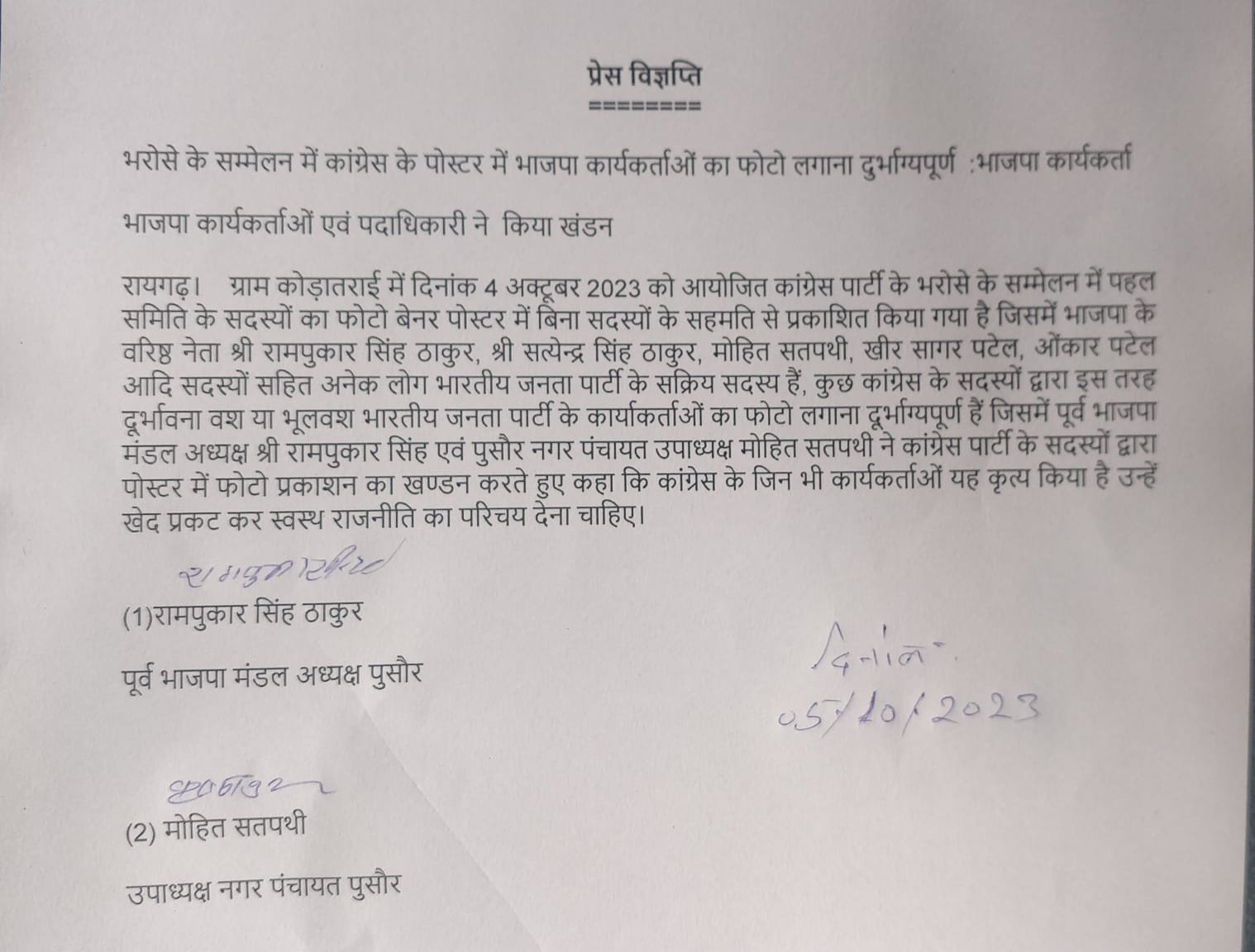 सामना:-रायगढ़:-ग्राम कोड़ातराई में 4 अक्टूबर 2023 को आयोजित कांग्रेस पार्टी के भरोसे के सम्मेलन में पहल समिति के सदस्यों का फोटो बेनर पोस्टर में बिना सदस्यों के सहमति से प्रकाशित किया गया है जिसमें भाजपा के वरिष्ठ नेता रामपुकार सिंह ठाकुर,सत्येन्द्र सिंह ठाकुर, मोहित सतपथी, खीर सागर पटेल, ओंकार पटेल आदि सदस्यों सहित अनेक लोग भारतीय जनता पार्टी के सक्रिय सदस्य हैं, कुछ कांग्रेस के सदस्यों द्वारा इस तरह दूर्भावना वश या भूलवश भारतीय जनता पार्टी के कार्याकर्ताओं का फोटो लगाना दूर्भाग्यपूर्ण हैं जिसमें पूर्व भाजपा मंडल अध्यक्ष रामपुकार सिंह एवं पुसौर नगर पंचायत उपाध्यक्ष मोहित सतपथी ने कांग्रेस पार्टी के सदस्यों द्वारा पोस्टर में फोटो प्रकाशन का खण्डन करते हुए कहा कि कांग्रेस के जिन भी कार्यकर्ताओं यह कृत्य किया है उन्हें खेद प्रकट कर स्वस्थ राजनीति का परिचय देना चाहिए।