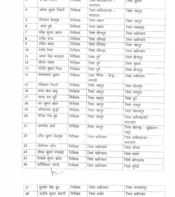 जारी आदेश के मुताबिक रायगढ़ जिले में पदस्थ कोतवाली निरीक्षक शनिप रात्रे को गौरेला-पेंड्रा-मरवाही में पदस्थ किया गया है साथ ही निरीक्षक विजय चेलक को सुकमा भेजा गया है।वहीं कमला पुसाम को रायगढ़ की जिम्मेदारी मिली है।अंबर सिंह भारद्वाज को बीजापुर ट्रांसफर कर दिया गया है,इनके अलावा सोनल ग्वाला को दुर्ग से सुकमा भेज दिया गया है और संजीव कुमार मिश्रा को भी दुर्ग से बीजापुर ट्रांसफर किया गया है। इसके अलावा परिवेश तिवारी को भाटापारा से सुकमा भेजा गया है। देखिए पूरी लिस्ट