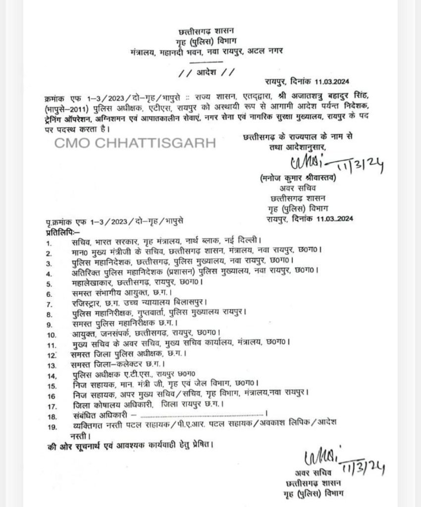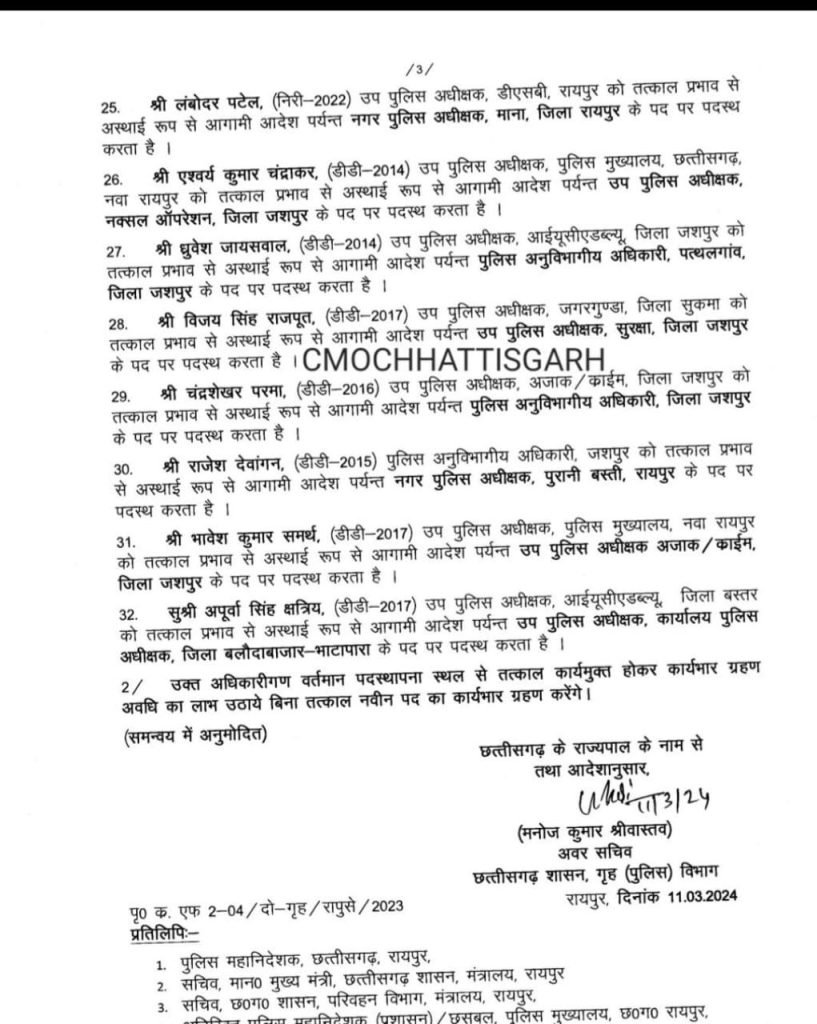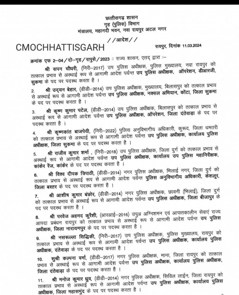 सामना:- Police Transfer:- 11 मार्च 2024:- छत्तीसगढ़ पुलिस विभाग में बड़ी प्रशासनिक सर्जरी की गई है। जिसमें 50 इंस्पेक्टर वर्ग के पुलिस अधिकारियों का तबादला आदेश जारी किया गया है।जारी आदेश में अधिकांश थाना प्रभारी शामिल हैं।