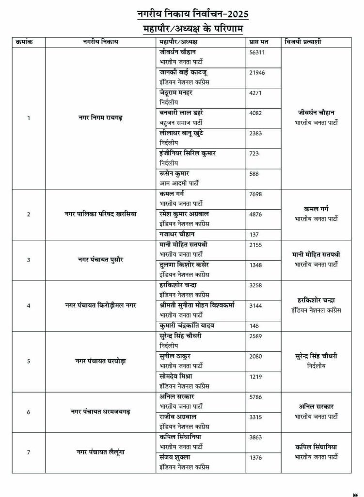 इसी तरह नगर पंचायत पुसौर में भाजपा से अध्यक्ष पद पर मानी मोहित सतपति चुनाव जीते,नगर पंचायत धरमजयगढ़ में भाजपा से अनिल सरकार,लैलूंगा से भाजपा के कपिल सिंघानिया ने जीत दर्ज की।