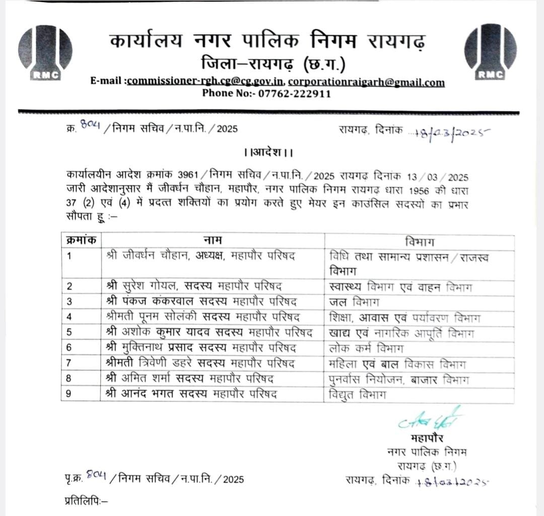Raigarh महापौर ने सौंपा एमआईसी को विभागों का प्रभार