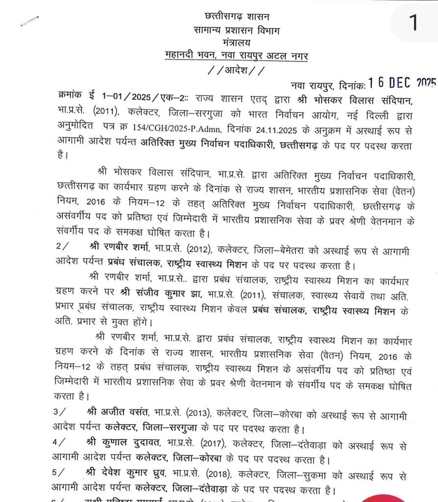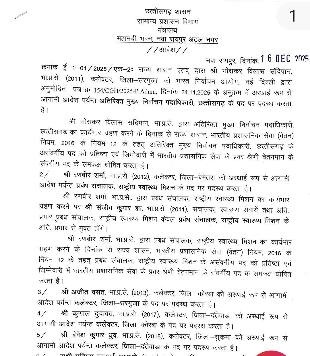 Samna.in छत्तीसगढ़ शासन सामान्य प्रशासन विभाग ने आदेश जारी करते हुए राज्य में कई जिलों के कलेक्टर बदले हैं,वहीं कुछ अधिकारियों को अतिरिक्त दायित्व भी सौंपा गया है।