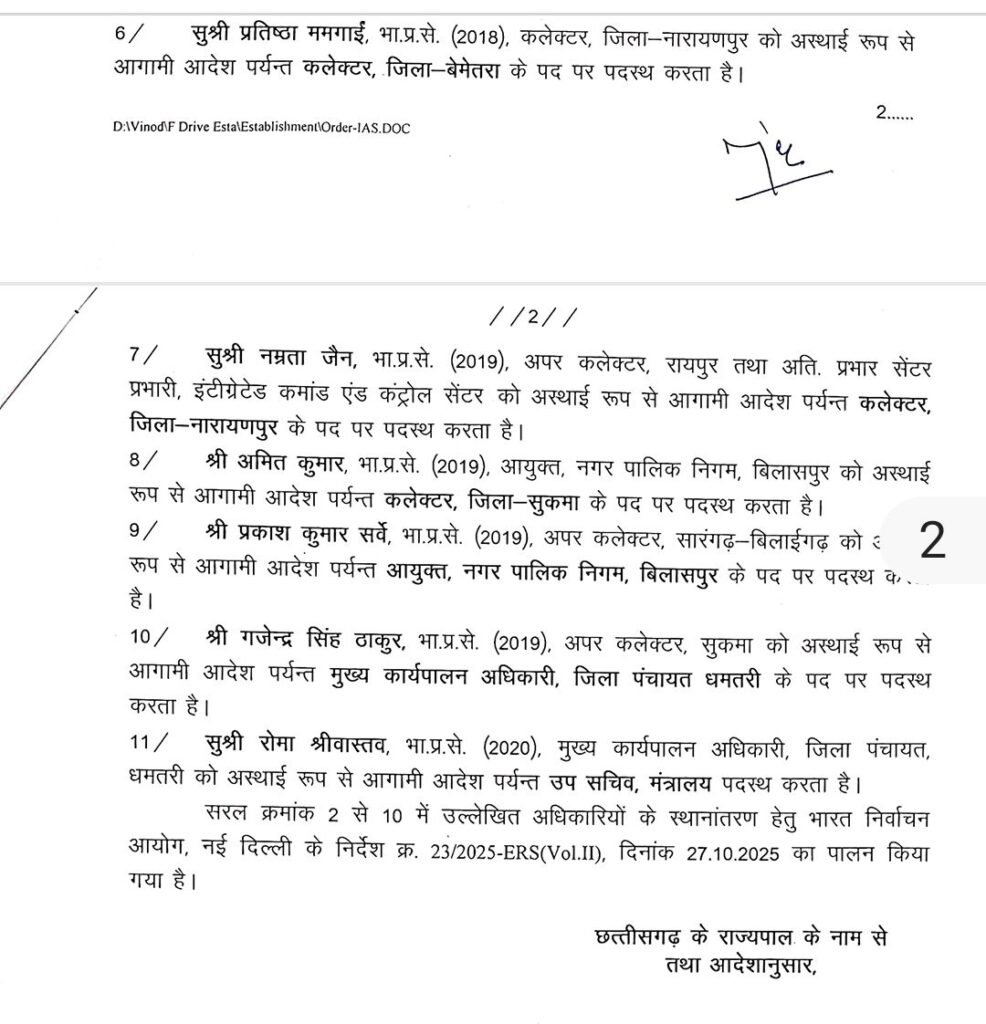 प्रतिभा मम्मई (IAS 2018) को बेमेतरा जिले से ट्रांसफर कर नारायणपुर जिले की जिम्मेदारी सौंपी गई।