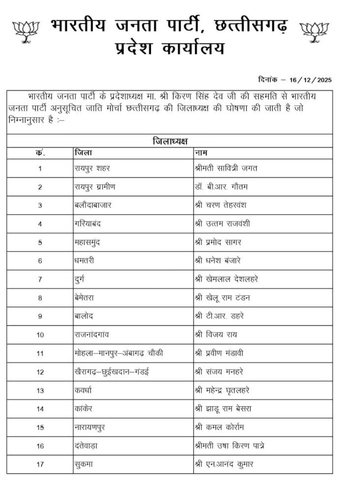छत्तीसगढ़ में भाजपा ने की अजा मोर्चा के पदाधिकारियों,जिला अध्यक्षों की घोषणा