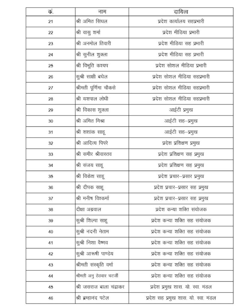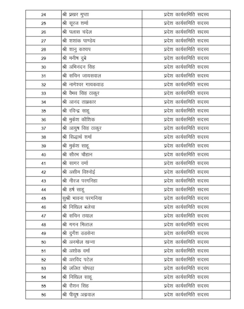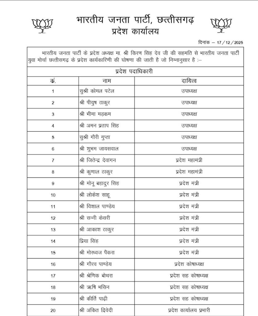 Samna.in छत्तीसगढ़ भाजपा ने युवा मोर्चा छत्तीसगढ़ की प्रदेश कार्यकारिणी, जिला अध्यक्षों- महामंत्रियों, प्रदेश कार्यसमिति एवं विशेष आमंत्रित सदस्यों की घोषणा की है