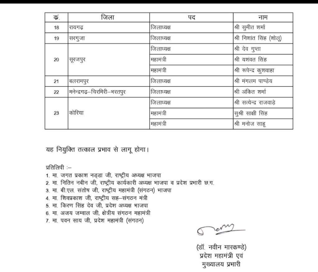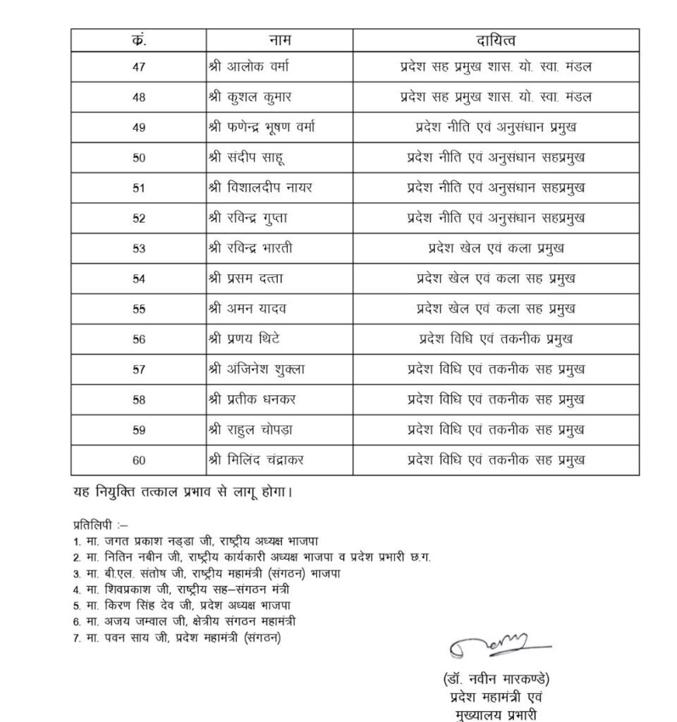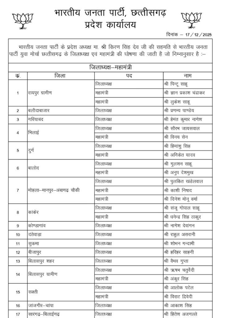 छत्तीसगढ़ में भाजयुमो जिलाध्यक्ष,महामंत्री,प्रदेश कार्यकारी सदस्य नियुक्त