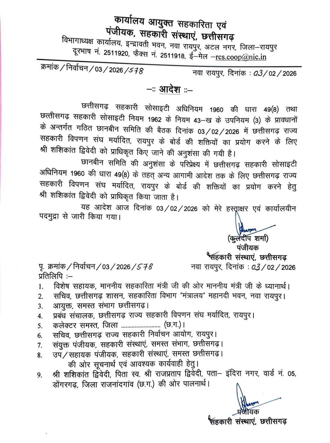 छत्तीसगढ़ राज्य सहकारी विपणन संघ मर्यादित, रायपुर के बोर्ड की शक्तियों का प्रयोग करने के लिए शशिकांत द्विवेदी को प्राधिकृत किया गया है।