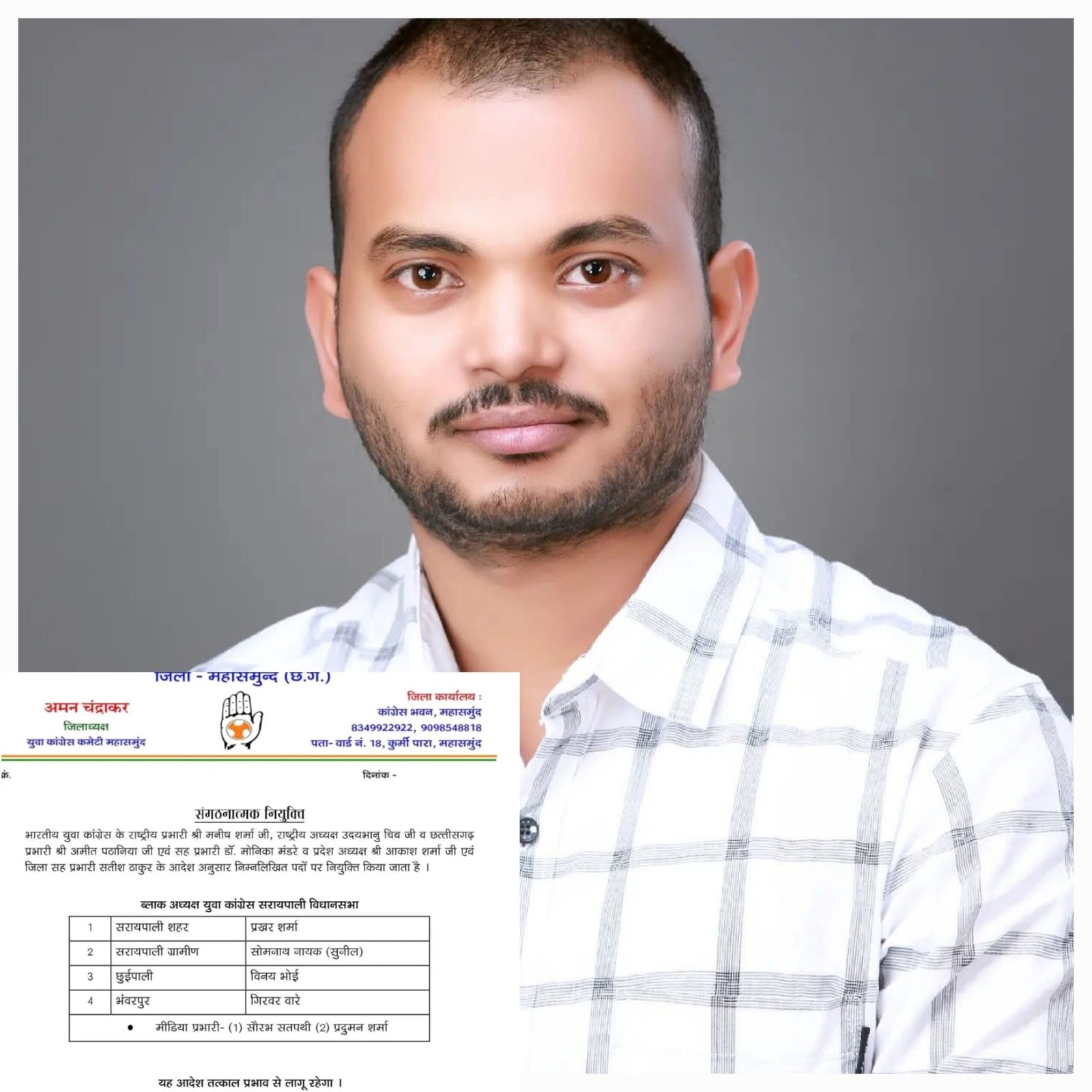 Samna.in सरायपाली/महासमुंद युवा कांग्रेस जिला अध्यक्ष अमन चंद्राकर ने युवा कांग्रेस की जिला कार्यकारिणी की घोषणा की है।