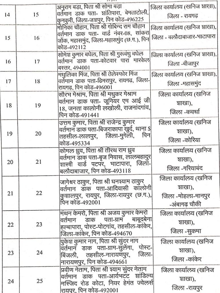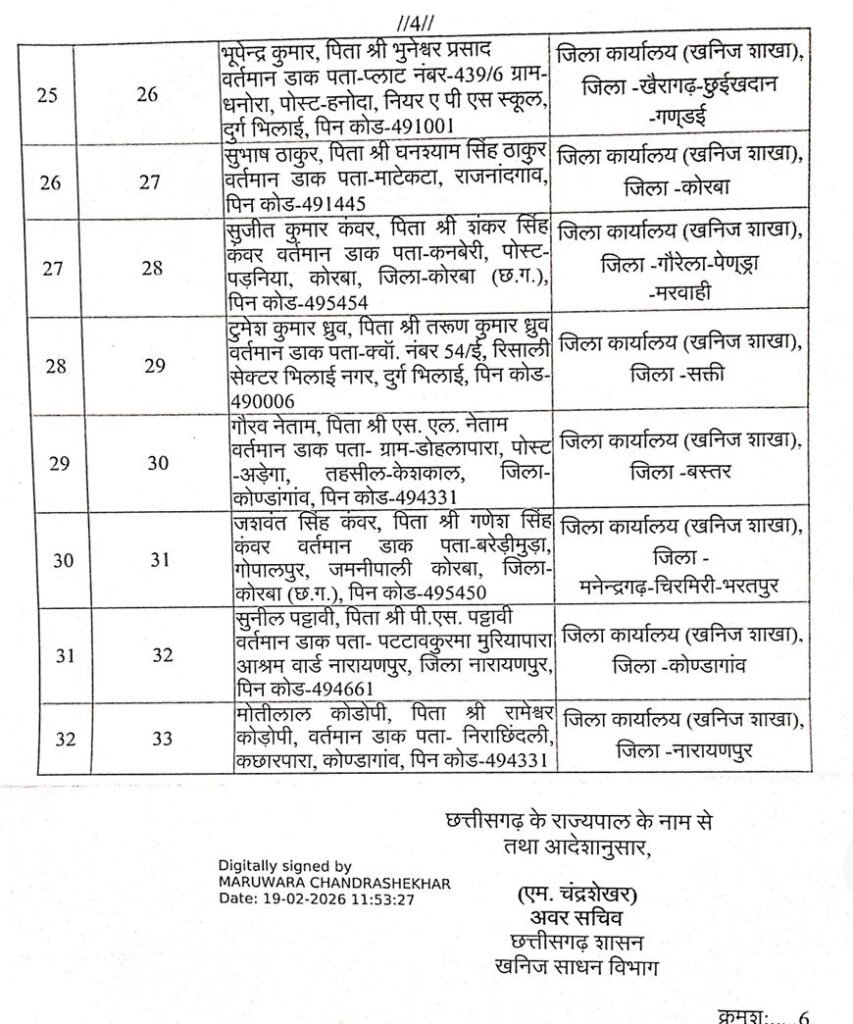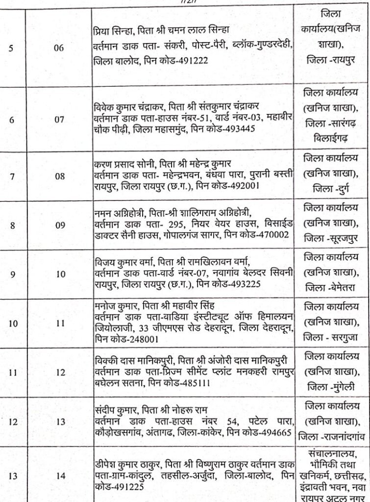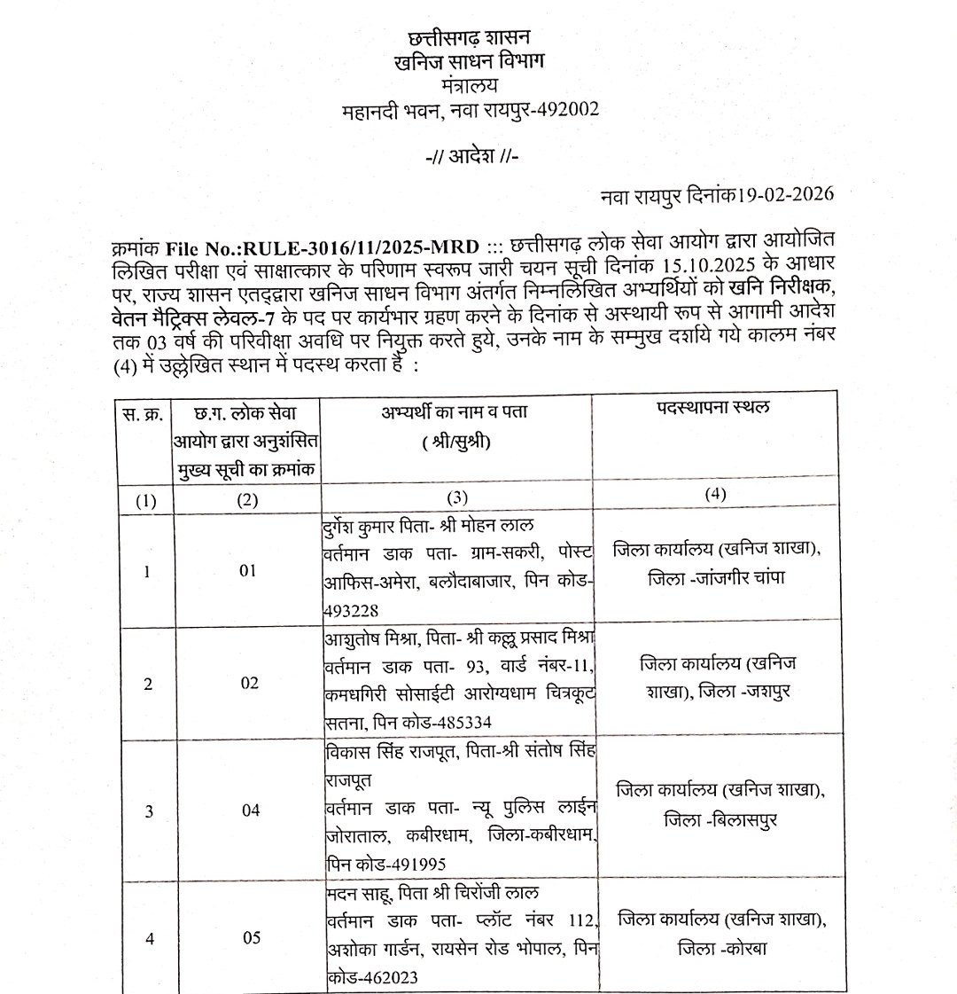 Samna.in छत्तीसगढ़ शासन खनिज साधन विभाग मंत्रालय ने आदेश जारी कर छत्तीसगढ़ लोक सेवा आयोग की चयन सूची के आधार पर 32अभ्यर्थियों को खनिज निरीक्षक के पद पर नियुक्त करते हुये पदस्थ किया है।