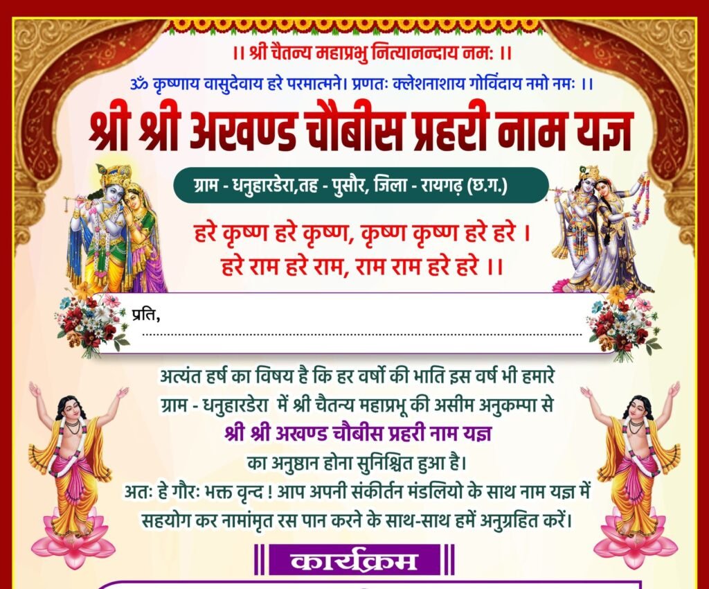 Samna.in Raigarh ग्राम धनुहार डेरा में भव्य नाम यज्ञ महामंत्र का आयोजन किया जा रहा है। इस धार्मिक आयोजन की शुरुआत 1 अप्रैल को कलश यात्रा के साथ विधिवत रूप से की गई है। जबकि 5 अप्रैल (रविवार) को नाम यज्ञ का समापन होगा। आयोजन के दौरान गांव में प्रतिदिन भक्ति और धार्मिक कार्यक्रमों की धूम रहेगी। समापन दिवस पर गांव में भव्य नगर भ्रमण ,कीर्तन भी किया जाएगा जिसमें श्रद्धालु बढ़-चढ़कर हिस्सा लेंगे। इस धार्मिक आयोजन में आसपास के क्षेत्रों से 50 से अधिक कीर्तन मंडलियां शामिल होकर भक्ति गीत और कीर्तन प्रस्तुत करेंगी। पूरे पांच दिनों तक ग्राम धनुहार डेरा का माहौल पूरी तरह भक्ति और श्रद्धा से सराबोर रहेगा। गांव में इस आयोजन को लेकर लोगों में भारी उत्साह देखा जा रहा है और पूरे गांव में हर्ष और उल्लास का वातावरण बना हुआ है।