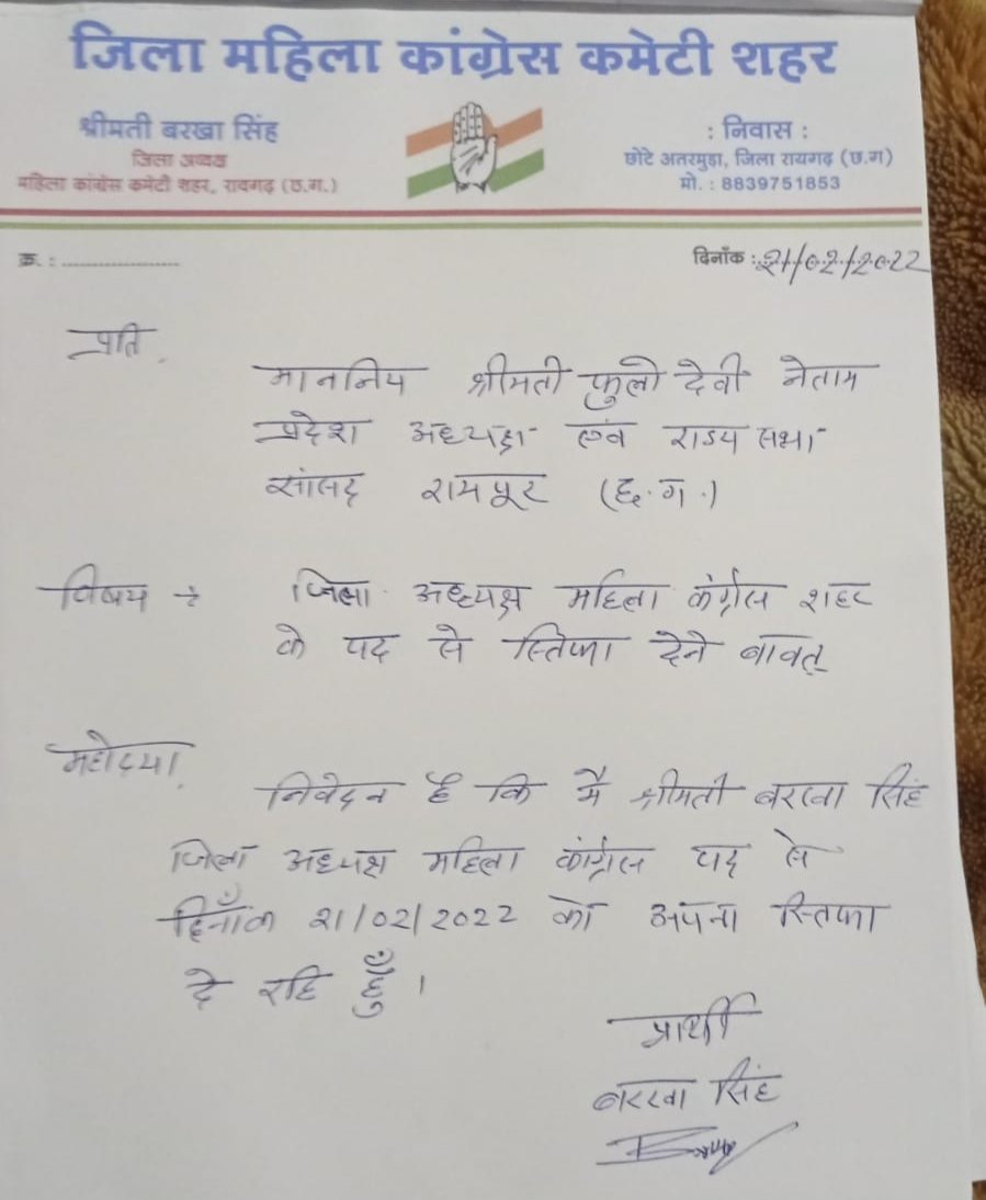 ब्रेकिंग न्यूज़:-इस्तीफ़े एपिसोड में आया नया मोड़…कांग्रेस महिला जिलाध्यक्ष ने दिया पद से इस्तीफा..
