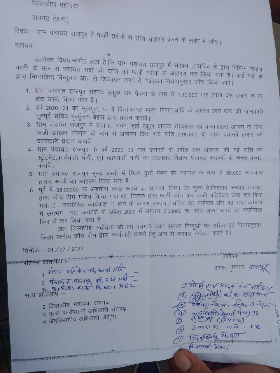 सामना न्यूज़:-रायगढ़:- रायगढ़ ज़िले के लैलूंगा के ग्राम पंचायत राजपुर के सरपंच नकुल राम पैकरा व सचिव पर उनके ही पंचायत सदस्यों ने भ्रष्टाचार का आरोप लगाया है और इस मामले में ज़िला स्तरीय टीम गठित कर न्यायोचित कार्रवाई की मांग कलेक्टर रानू साहू से की है।दरअसल पंचायत सदस्यों का कहना है कि सरपंच एवम सचिव द्वारा लगातार गलत तरीके से बिल लगाकर विकास के नाम पर लोगों के साथ साथ सरकार को भी चपत लगाने में कोई कसर नही छोड़ी गई है।विभिन्न निर्माण कार्यों के लिए पंचायत मद की राशि सरपंच व सचिव द्वारा फर्जी तरीके से आहरण किया गया है।क्योंकि खर्च की गई राशि से न तो निर्माण कार्य पूरे हुए और न ही पंचायत सदस्यों की इसकी जानकारी दी गई। उन्होंने आरोप लगाया है कि 2020 से लेकर अब तक सरपंच के नाम से स्वच्छ भारत मिशन के तहत एक लाख दस हज़ार की राशि,ग्राम पंचायत राजपुर में पंचायत भवन, स्कूल व छात्रावास हेतु तकरीबन दो लाख पंचानबे हज़ार की राशि,मुख्य मार्ग स्थित दुर्गा मंडप की मरम्मत के लिए पचास हज़ार की राशि आबंटित की गई है लेकिन इस बारे में सरपंच व सचिव दोनों ही ने चुप्पी साध रखी है।इसके पूर्व भी सरपंच द्वारा 38 लाख रुपये का घोटाला किया जा चुका है।जिसकी शिकायत करने पर जांच के लिए जनपद पंचायत द्वारा टीम गठित की गई साथ ही जनपद पंचायत के सीईओ ने विभागीय जांच के आदेश दिए थे लेकिन उसमें भी इनके द्वारा फर्जी जांच कर फर्जी प्रतिवेदन प्रस्तुत किया गया और मामले में न्यायोचित कार्रवाई नहीं की गई लिहाज़ा सरपंच व सचिव का मनोबल बढ़ता ही गया।वर्तमान में जनवरी 2022 से अप्रैल तक मे करीब 7 लाख रुपये का फर्जीवाड़ा पुनः किया गया है। इसलिए इस पर तत्काल संज्ञान लेकर उचित कार्रवाई की मांग की है। मिली जानकारी के अनुसार जनपद एवं जिला पंचायत में कई बार सरपंच व सचिव के ख़िलाफ़ शिकायत की जा चुकी है बावजूद इसके अब तक इन पर कोई कार्रवाई नहीं की गई।