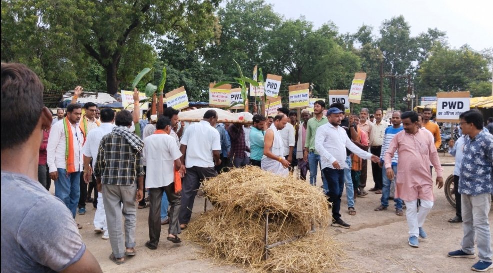 पीडब्ल्यूडी विभाग की अर्थी कांधे पर रख प्रदर्शनकारियों ने पूरे PWD रेस्टहाऊस से साप्ताहिक बाजार होते हुए जनपद पंचायत कार्यालय तक भ्रमण कर बस स्टैंड मे अन्तिम संस्कार किया गया। इस दौरान प्रदर्शनकारियों द्वारा राम नाम सत्य है-कांग्रेसी मदमस्त है और जनता त्रस्त है तथा भूपेश बघेल-मुर्दाबाद का नारा जमकर लगाया गया।