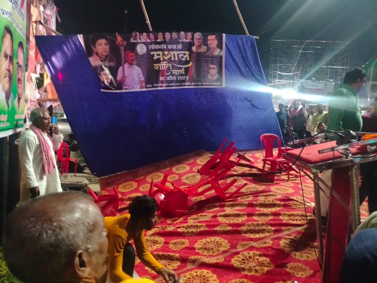 क्या है मामला:- दरअसल वरिष्ठ नेता राहुल गांधी की संसद से सदस्यता समाप्त किए जाने के विरोध में कांग्रेस ने रविवार को बिलासपुर में लोकतंत्र बचाओ मशाल जुलूस का आयोजन किया । गांधी चौक से शुरू हुई इस मशाल जुलूस में प्रदेश प्रभारी शैलजा कुमारी, प्रदेश अध्यक्ष मोहन मरकाम, डॉ चंदन यादव जिला अध्यक्ष विजय केशरवानी, शहर अध्यक्ष विजय पांडे, एपेक्स बैंक के चेयरमैन बैजनाथ चंद्राकर,समेत जिले के नेता मौजूद थे। मशाल जुलूस गांधीचौक से शुरू होकर जुनाबिलासपुर गोलबाजार, सादर बाजार होते हुए देवकी नंदन दीक्षित चौक पहुची। जहा सभा के लिए बनाया गया मंच भरभराकर गिर गया। मंच पर रखा डायस माइक बैटरी सब नाली में समा गया। जिससे सभा नही हुई नेता और कार्यकर्ता नारेबाजी करते लौट गए। बहरहाल हर छोटे बड़े नेता को पार्टी के प्रमुख नेताओं के साथ दिखने का शौक होता है लेकिन कांग्रेसी इस दौरान प्रोटोकॉल मेंटेन करते तो शायद ऐसा नही होता, पर कांग्रेसियों को फोटो खींचना और अपनी उपस्थिति भी तो दर्ज करानी थी, जिसके चलते मंच टूट गया।इस हादसे के बाद चर्चा जोरों पर रही कि आखिर जिम्मेदार कौन?